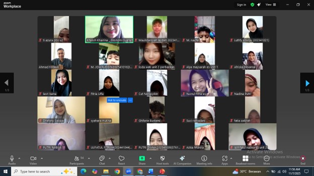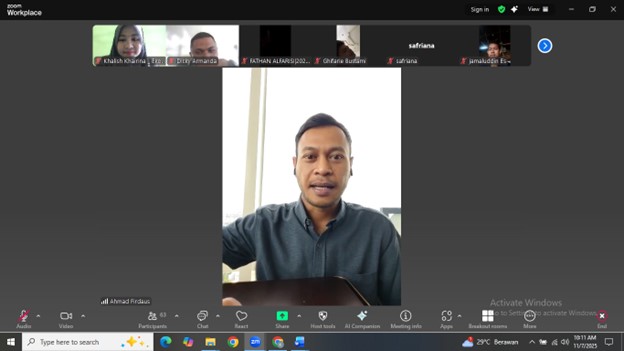 Lhokseumawe, 7 November 2025 - Jurusan Ekonomi Syariah Fakultas Ekonomi dan Bisnis Islam (FEBI) UIN Sultanah Nahrasiyah Lhokseumawe kembali menyelenggarakan kegiatan Visiting Guest Lecturer pada Jumat, 7 November 2025. Kegiatan yang dilaksanakan secara daring melalui Zoom Meeting ini mengangkat tema “Protecting Bank Customers through Insurance” dan menghadirkan narasumber profesional dari industri perbankan, yaitu Ahmad Firdaus, Executive Bancassurance Officer Panin Bank Jakarta.