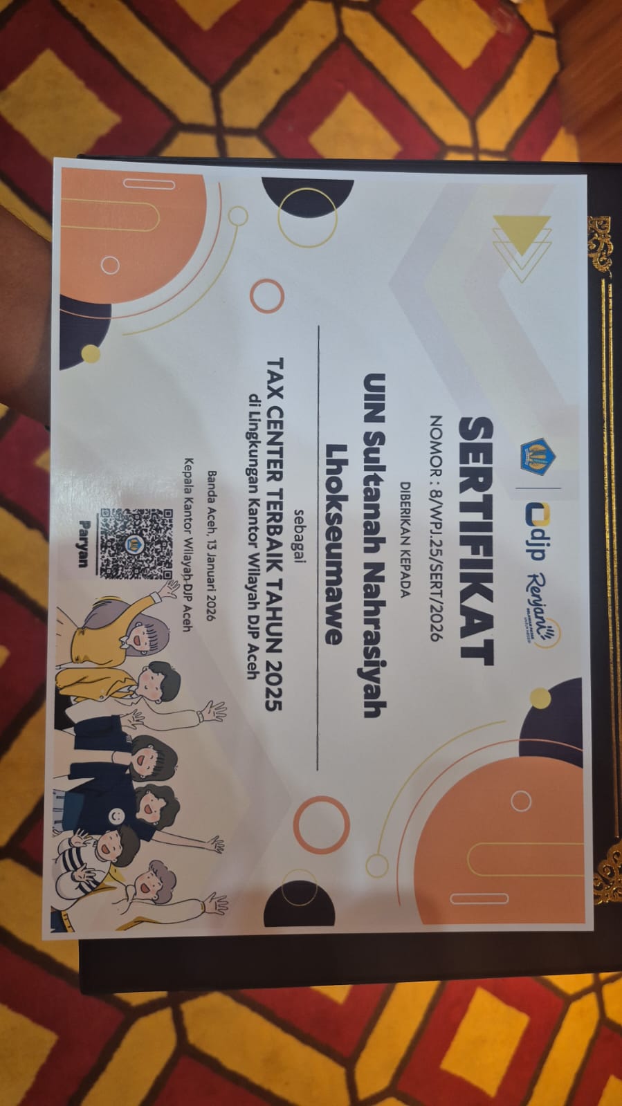 Penghargaan tersebut diberikan sebagai bentuk apresiasi atas komitmen, dedikasi, serta kontribusi aktif Tax Center UIN Sultanah Nahrasiyah Lhokseumawe dalam mendukung program Direktorat Jenderal Pajak, khususnya dalam bidang edukasi perpajakan, pendampingan wajib pajak, serta peningkatan literasi dan kesadaran pajak di kalangan akademisi dan masyarakat.